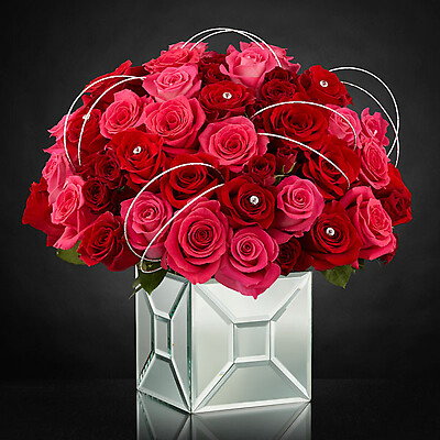 Designed to capture the heart, this bouquet goes above and beyond to create a space where modern style and loves every wish unite. Hot pink roses, red roses, and red spray roses are arranged to perfection and embellished with sparkling stone accents at the center of select blooms, as well as, silver wires to create a fascinating looping effect, taking the average rose bouquet to a new level of sophistication. Tying everything together is the modern mirrored vase that brings light and love to this unique design.